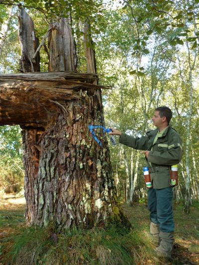 Marquage d'un "arbre bio" qui sera conservé pour l'accueil de la biodiversité. Crédit photo : David Robert. ONF